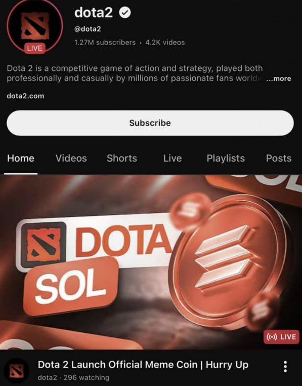 Канал Valve з Dota 2 на 1,3 мільйони підписників опинився в руках крипто-шахраїв. Невідомі захопили соцмережі доти аби прорекламувати скам-койн Dota2coin, який з'явився за декілька годин до взлому. Проте "рекламна кампанія" тривала не довго, шахрайство швидко викрили і прибрали записи трансляції зі сторінки.